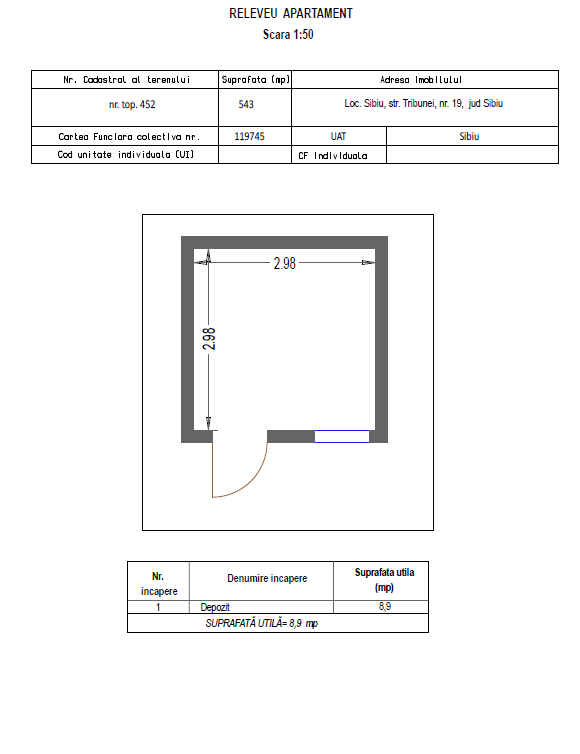 Spațiul are o suprafață de 8,90 m2. Spațiul se poate închiria cu destinația depozit.